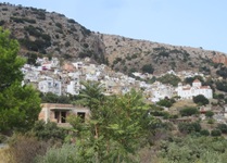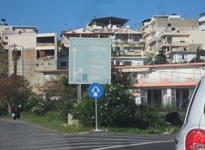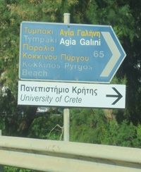 Die Wegweiser auf Kreta sind sparsam verteilt und enthalten manchmal Ortsnamen, die nicht identisch mit denen auf der Landkarte sind. Häufig sind sie kaum lesbar (blauer Hintergrund, hellblaue ausgebleichte Schrift). Manchen Kreuzungen mussten wir uns aus verschiedenen Richtungen nähern, um den für uns geeigneten Wegweiser zu finden.