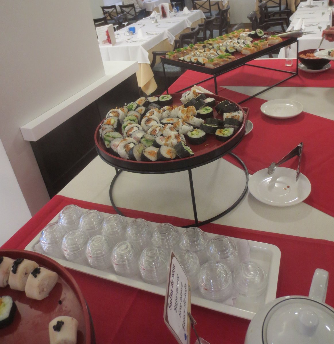 Über das Essen und die Bedienung gab es nichts zu meckern. Die Auswahl war sehr umfangreich, fast leere Platten wurden schnell durch volle ersetzt. Warme Speisen waren tatsächlich warm. Die Bedienungen waren schnell im Bringen von Getränken und Abräumen von leeren Tellern.